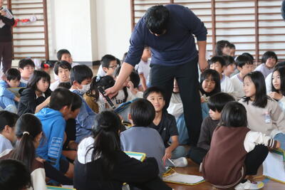 4年生からは「焼き板はどうやって作るんですか」?「いかだは何人乗りですか?」「野外炊飯で大変だったことは何ですか?」など多くの質問が出されました。5年生は、実際に作ったものを見せるなど、質問に丁寧に答えており、さすが高学年だなと感じる場面でした。