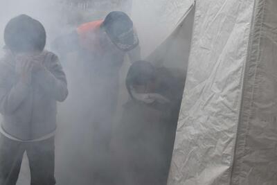 6年生が「防災スタディ」として「濃煙体験」と「心肺蘇生法」を行いました。