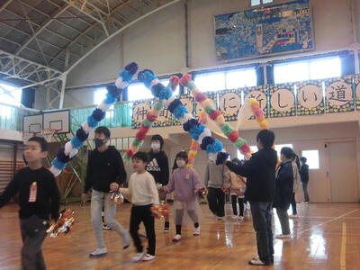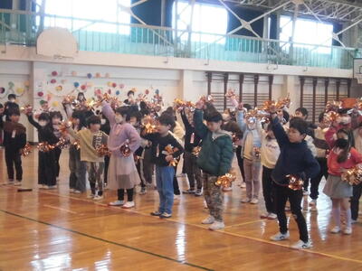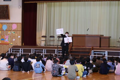 間もなく卒業する6年生に、各学年から「お祝いの言葉」「感謝の言葉」「励ましの言葉」そして、工夫を凝らしたアトラクションのプレゼントがありました。
