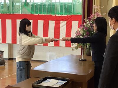 修了式の後、教室では担任から一人一人に修了証書が渡されました。担任からは、それぞれの頑張りについて励ましの言葉が送られていました。