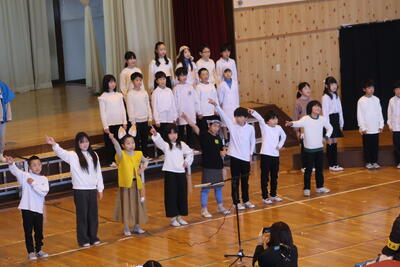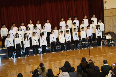 子供たちにとっての「ふるさと・七ヶ浜」はどんな町なのか。プレゼンテーション、マット運動、リコーダー奏と合唱で、七ヶ浜への思いを表現しました。